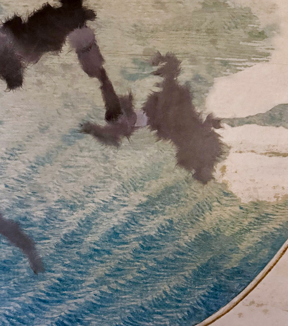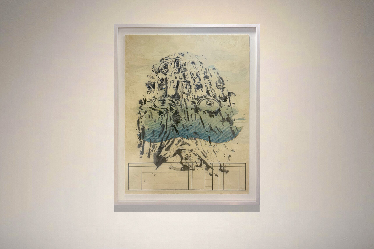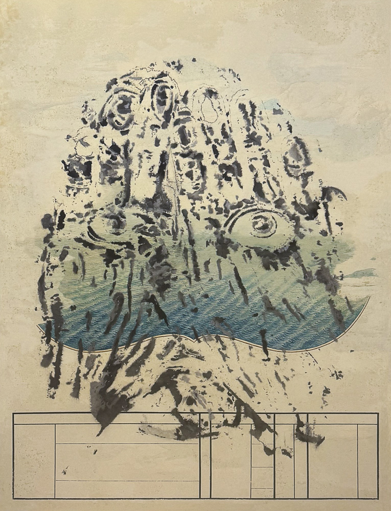 The work brings together a modified early map of colonial forces, a seascape, and an archival chart once used to record enslaved people—counting those captured, alive, or dead. These elements collide within a single surface, where geography, administration, and loss overlap.