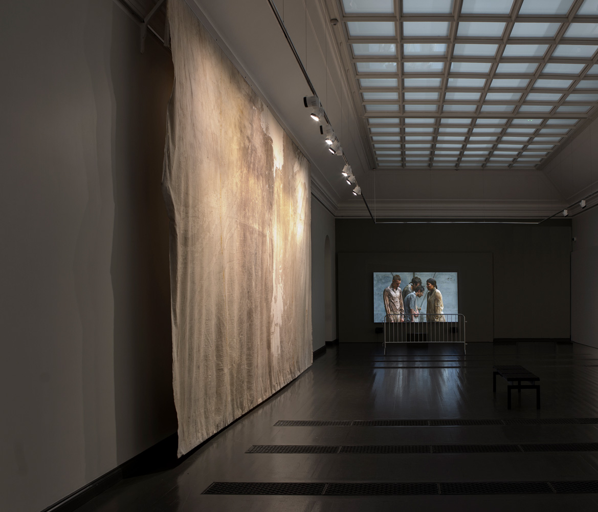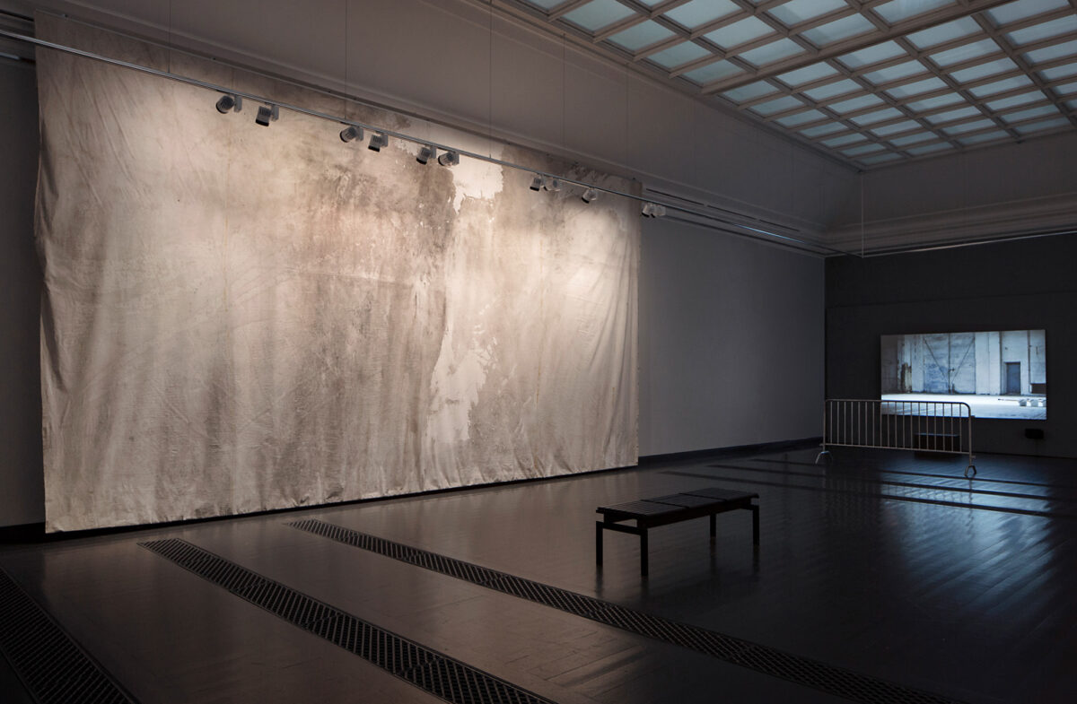 The installation extends this action into the exhibition space. The same 400 × 800 cm canvas on which the performers stood—absorbing pigment, water, and residue—is later suspended 20 cm from the wall. Transformed into a large-scale painting, it becomes a physical trace of the event: a loose, breathing surface that carries the memory of the ritual.
