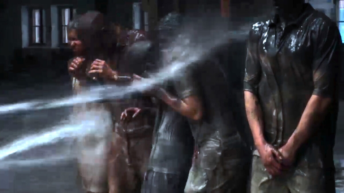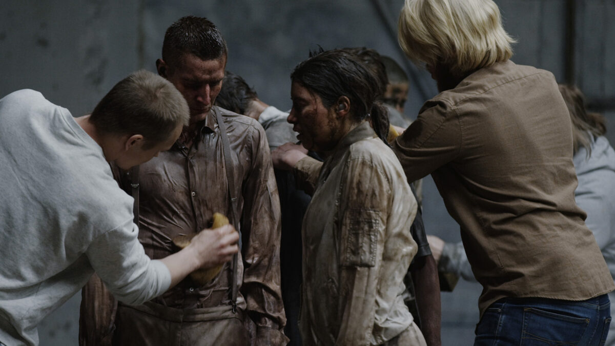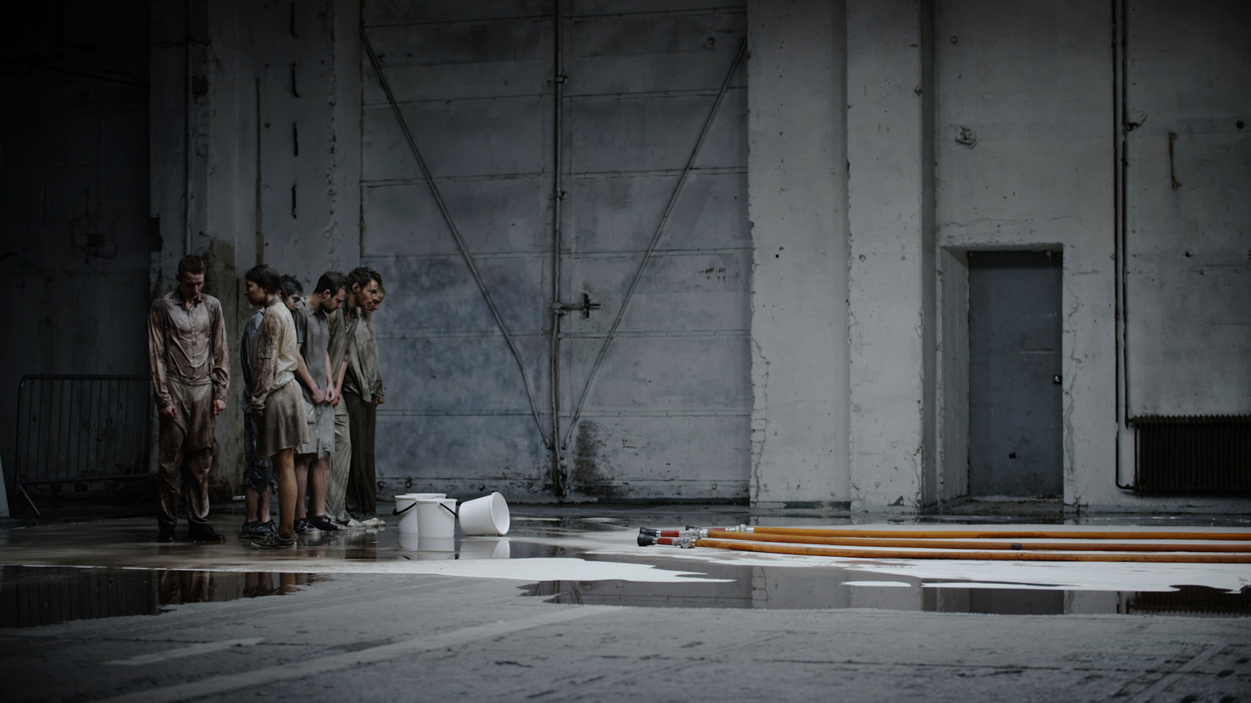 Cleansing examines the violent notion of “purifying” individuals—removing politically undesirable identities, beliefs, or skin tones to render them acceptable within a dominant order. In the video, participants are blasted with high-pressure water jets, their bodies darkened with pigment. White figures then scrub them with soap, while uniformed police officers stand by passively. As the pigments wash away, color drips and pools onto the large canvas beneath their bodies, recording the act in real time.