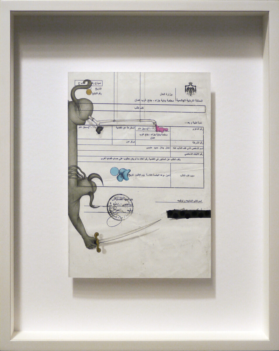 Court Room originates from a real legal case involving a personal accusation. The proceedings were conducted in the artist’s absence, and he later received a set of scanned legal documents from his lawyer. These documents form the sole material basis of the work.