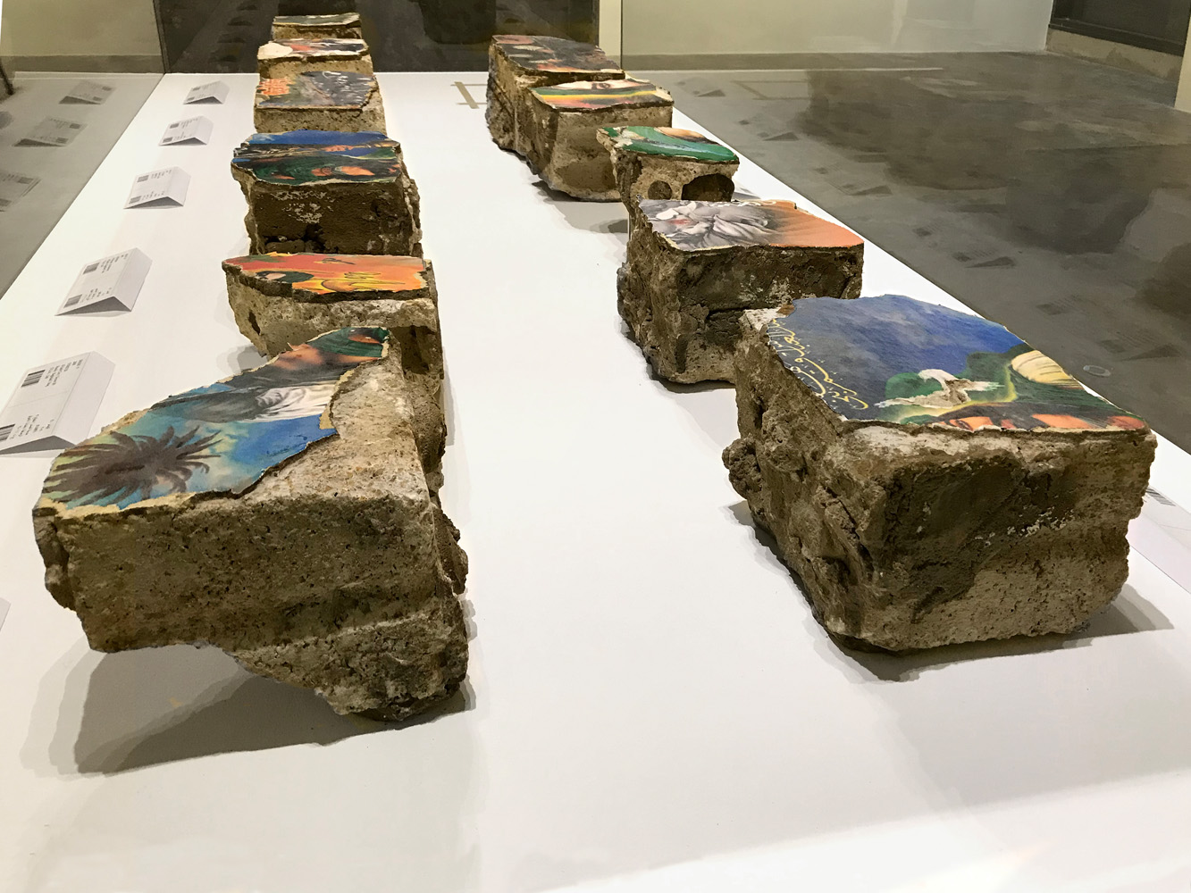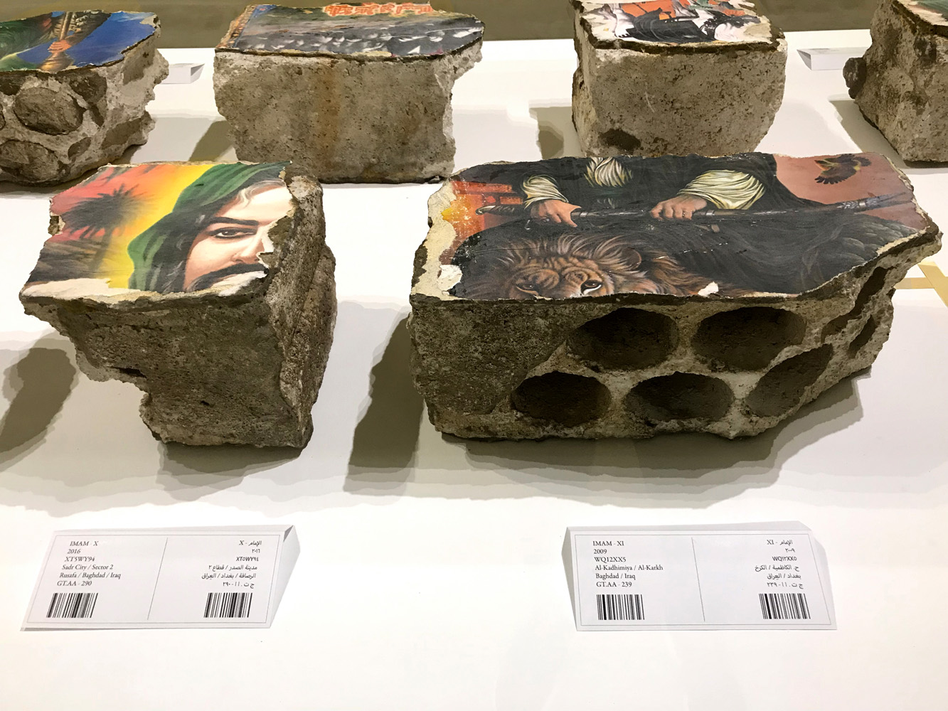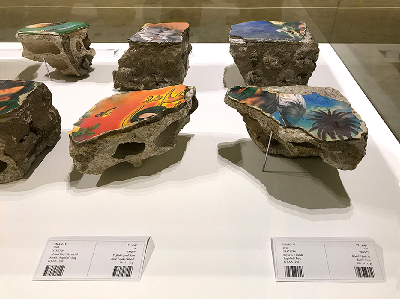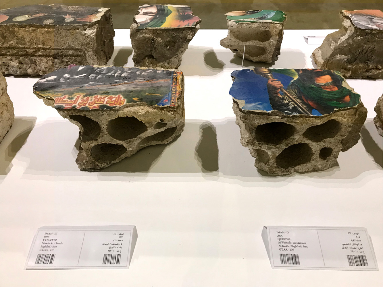 Debris consists of eleven fabricated objects resembling hollow concrete bricks—artificial remnants that mimic materials commonly found after the dismantling of temporary display walls in Iraq. Such walls are often erected during religious memorials, particularly those commemorating the death of one of the Imams. They become saturated with printed posters replicating Iranian-style depictions of the Twelve Imams, images that function simultaneously as devotion, propaganda, and visual noise within the urban landscape.
