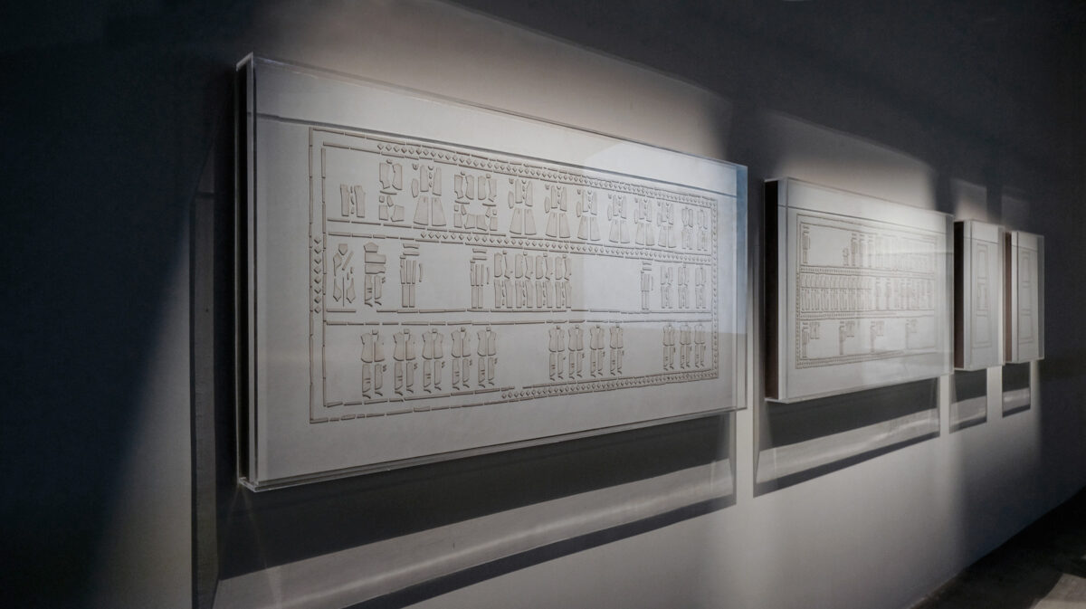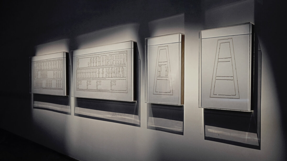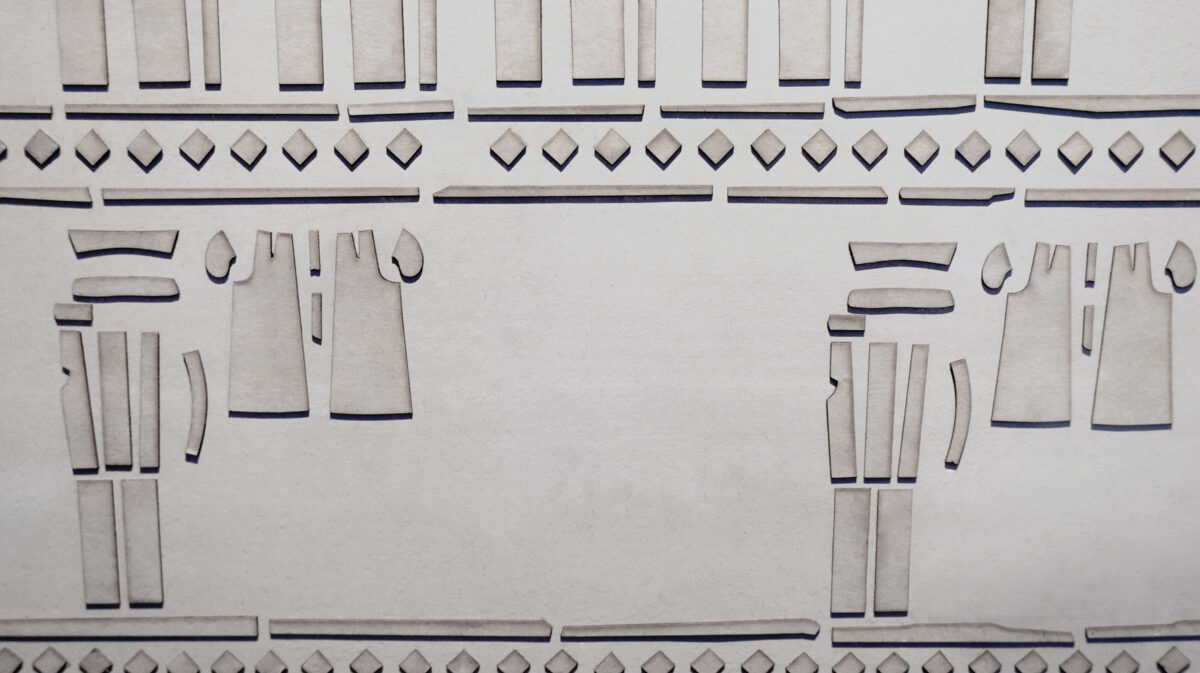 Patterns—created as miniature templates for the tailor in the video—were designed for the small sculpted figurines, allowing him to measure and construct their unfitted garments. These tiny paper cut-outs, mounted on aluminum sheets and enclosed within acrylic box frames, extend the narrative into the physical space.