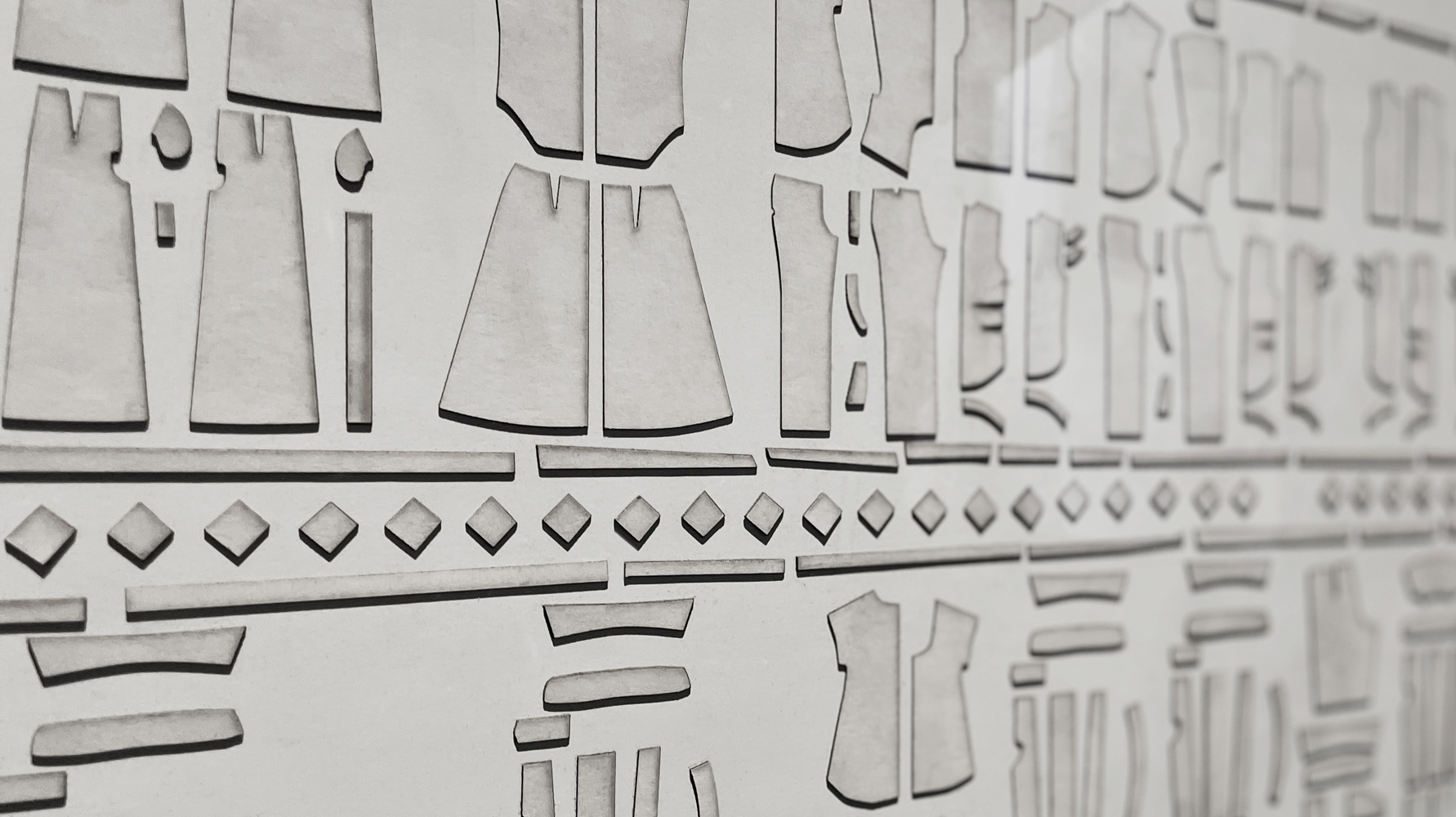 Patterns—created as miniature templates for the tailor in the video—were designed for the small sculpted figurines, allowing him to measure and construct their unfitted garments. These tiny paper cut-outs, mounted on aluminum sheets and enclosed within acrylic box frames, extend the narrative into the physical space.