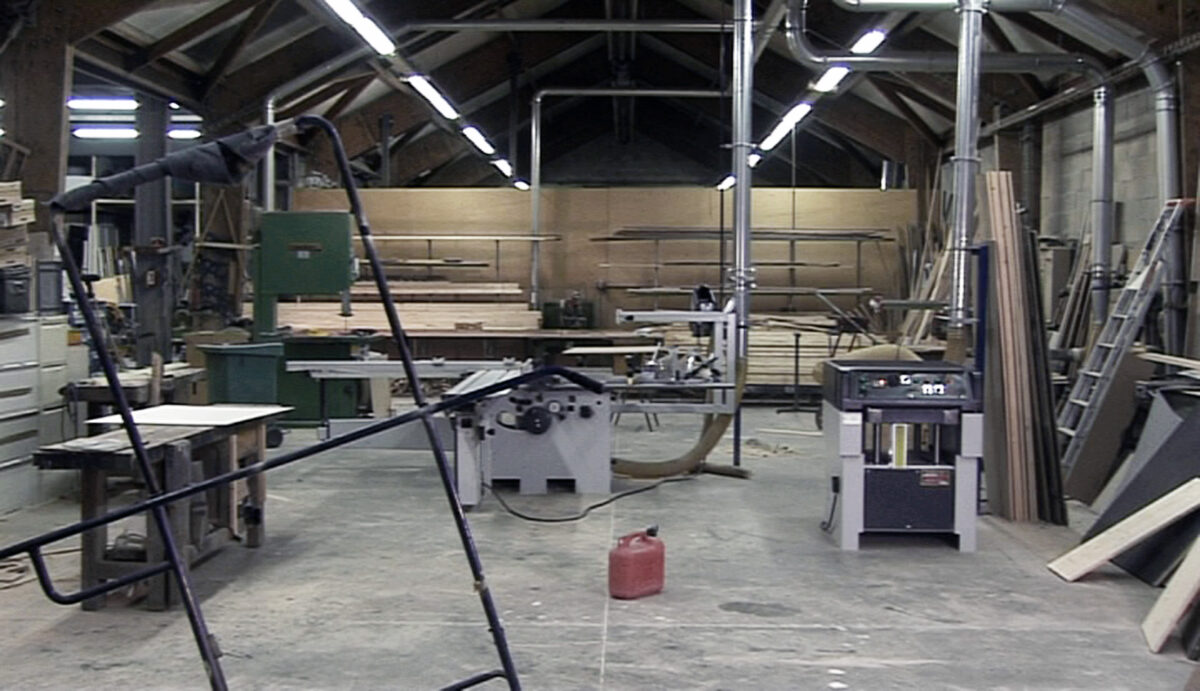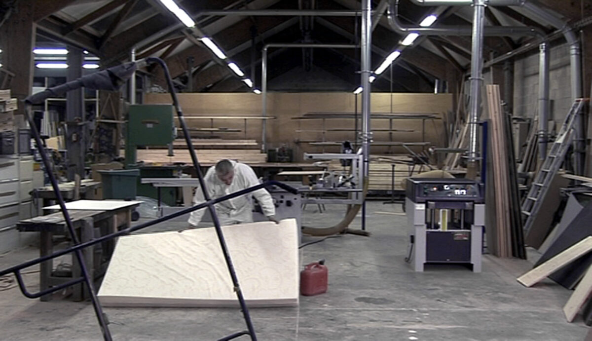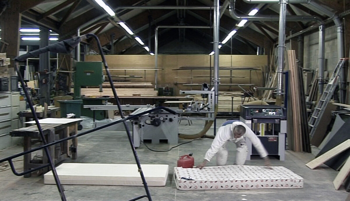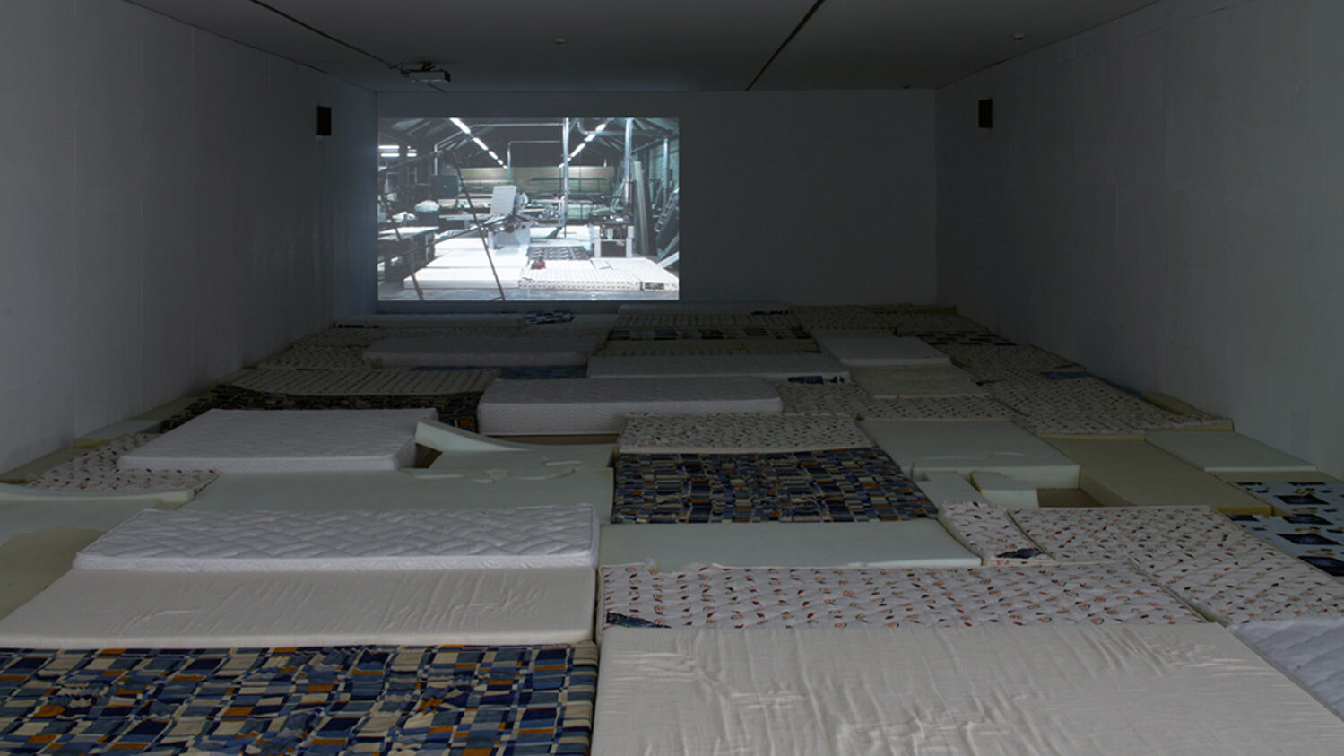 In the video, the artist performs a deliberate, methodical action, covering the entire floor of a rough industrial workshop with mattresses—objects associated with rest, intimacy, and domestic life—without moving or altering any of the existing machinery or debris.
