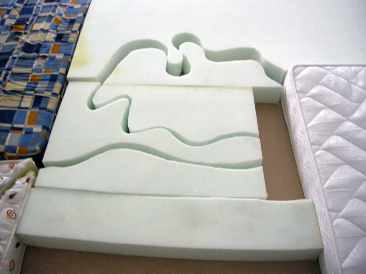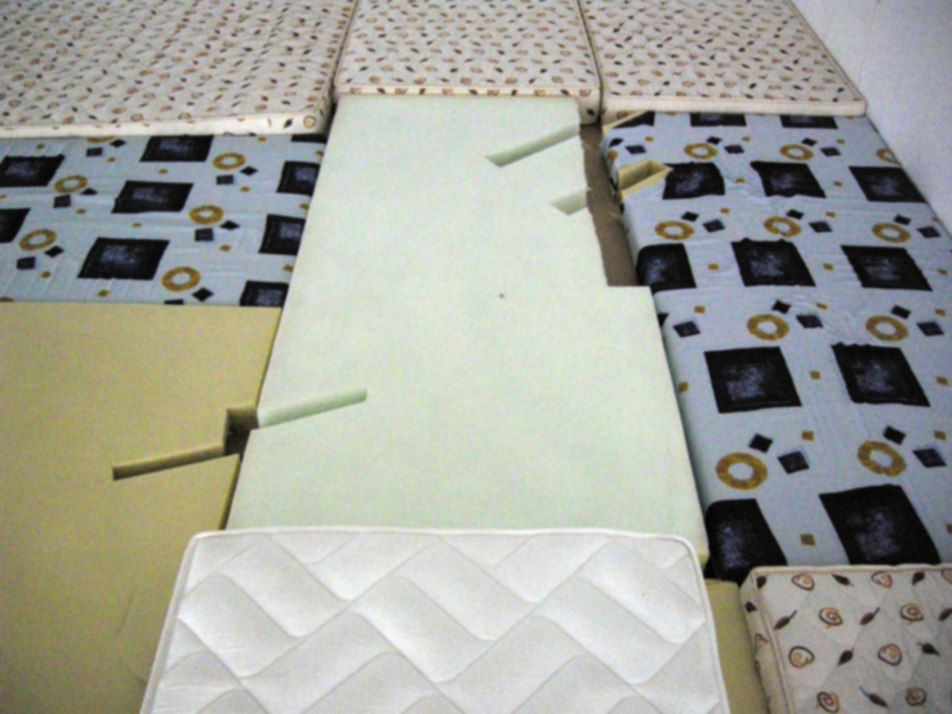 The installation extends into the exhibition space. The floor is covered with intact mattresses, placed side by side. Between them are separate cut-out forms—shapes derived from elements found in the workshop, such as a cable, a wheelbarrow, or a wooden plank. Visitors walk across this uneven surface, physically experiencing the challenge of balance within a space not designed for comfort or safety.