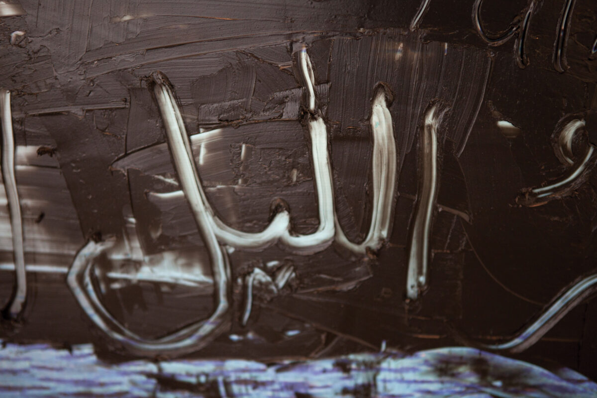A landscape image sealed under acrylic and coated with black grease, inviting viewer intervention. The work reflects how memory and images are reshaped by war.