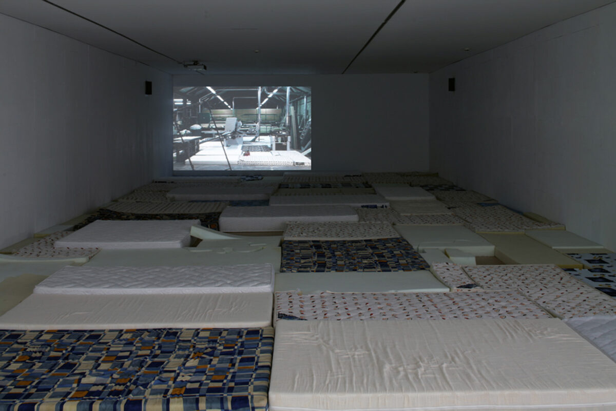 A video installation in which mattresses cover an industrial landscape. The floor becomes an attempt to create temporary stability within harsh conditions.