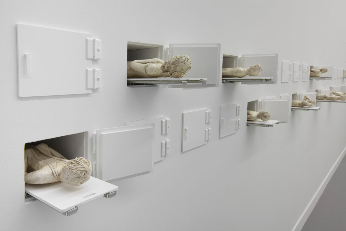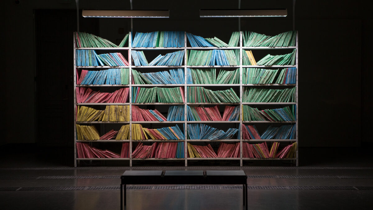 A life-size kinetic archive where folders glide across shelves in a silent loop. History is treated as a system shaped by visibility, classification, and omission.