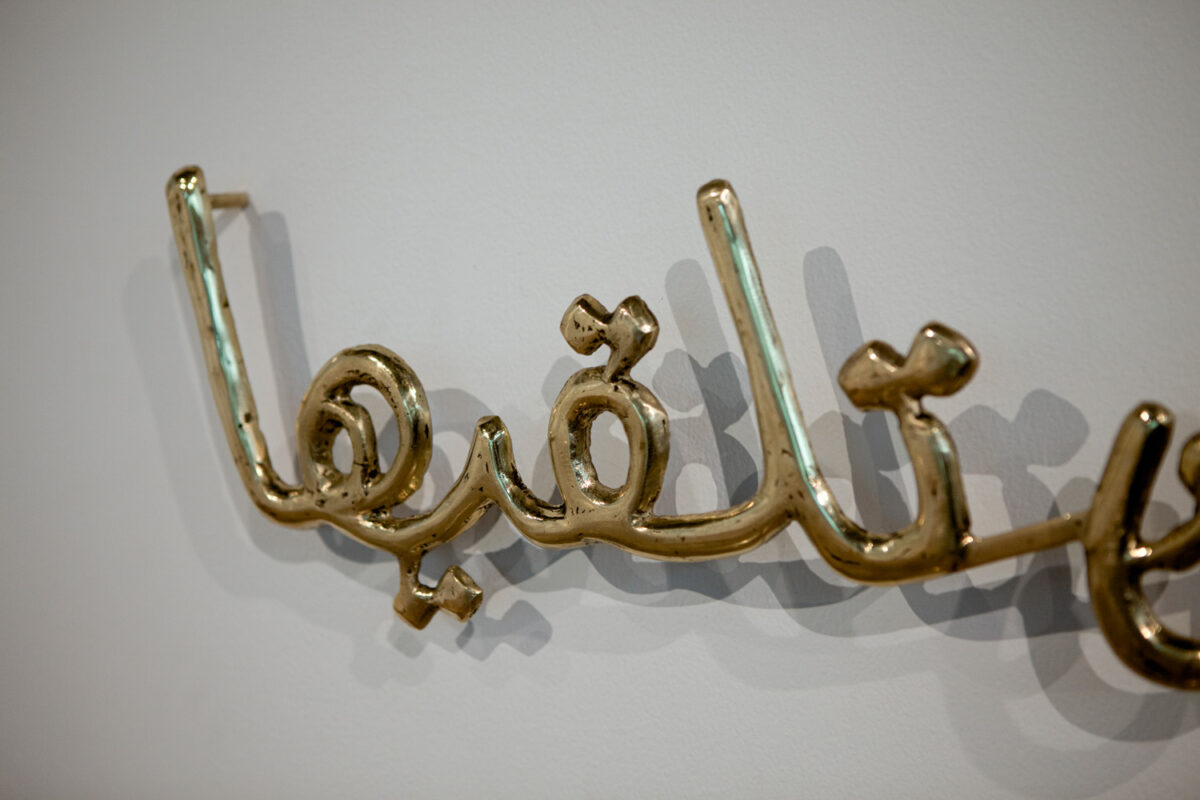 Fragments of Iraqi propaganda lyrics are cast in copper, exposing the weight of language used for ideological control.
