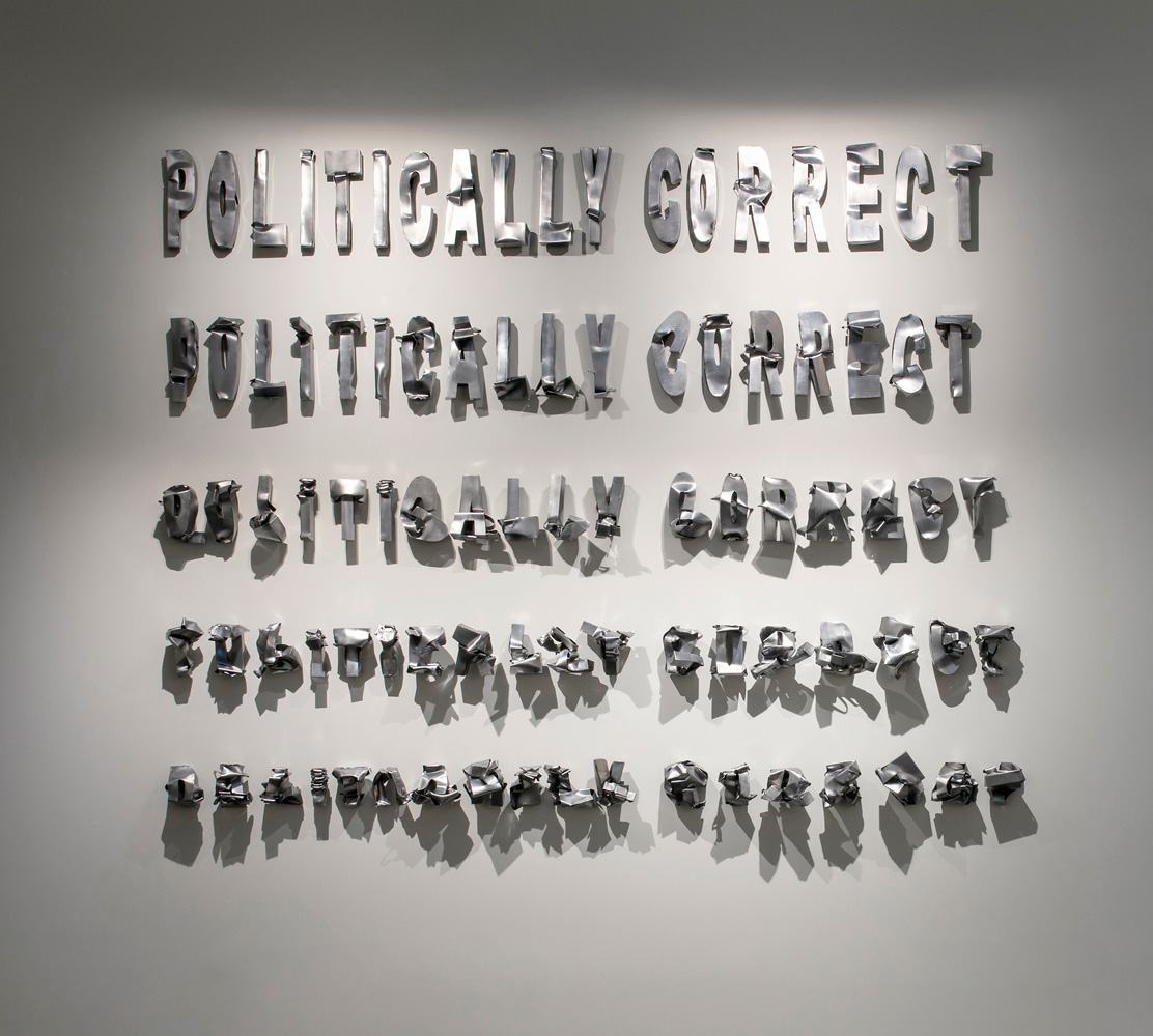 Five stainless-steel sentences progressively distort, visualizing the fragility of language under social pressure.