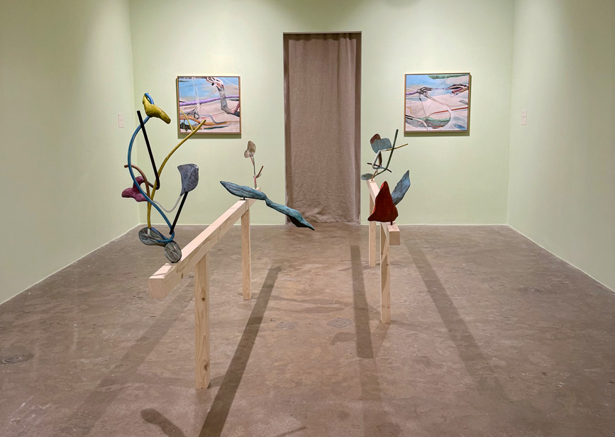 Six sculptural works carry fractured horizons and suspended remnants into the physical space.
