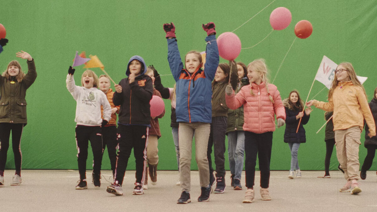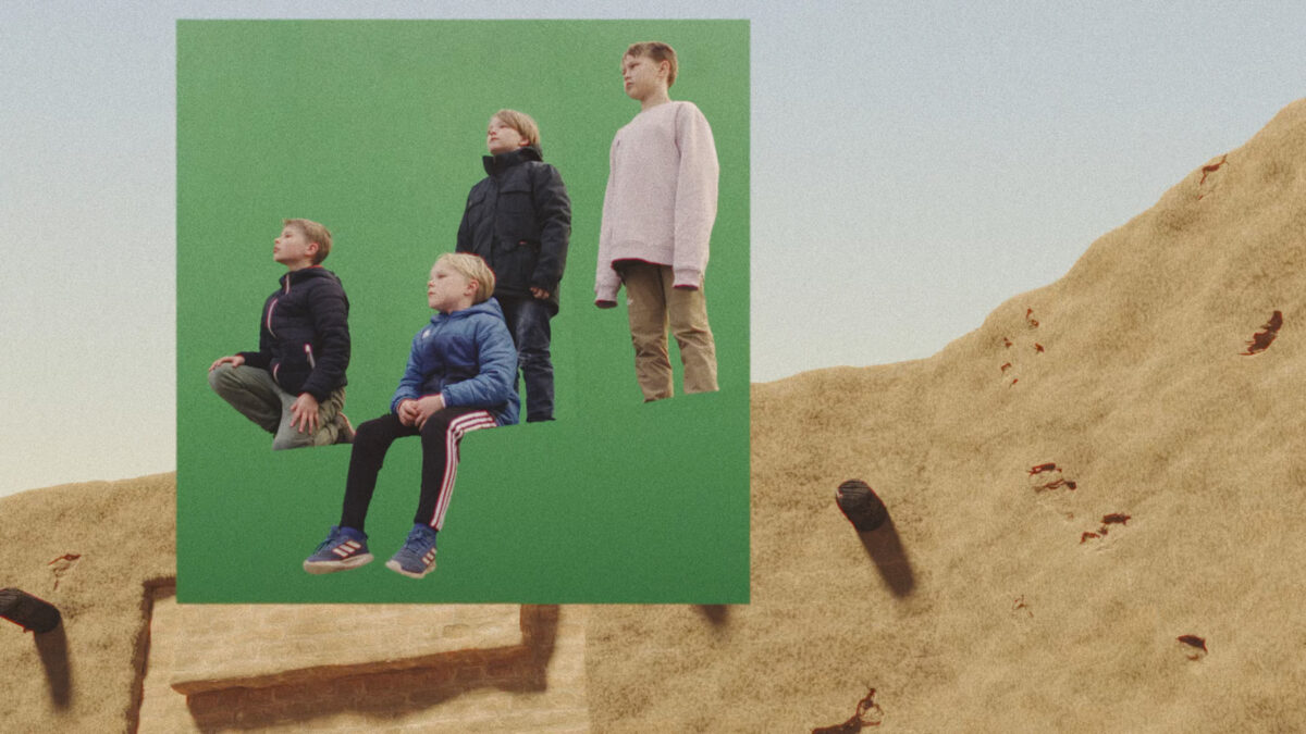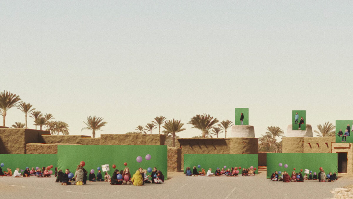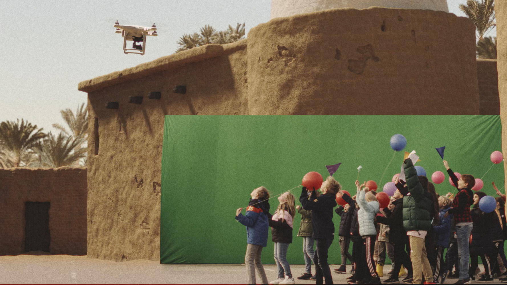 Western children appear inside digitally rendered environments replicating Madina as portrayed in Al-Akkad’s film, holding handmade welcoming signs before a chroma screen. The scene is suddenly pierced by the arrival of a drone—an emblem of contemporary surveillance and warfare—shifting the atmosphere from hope to threat and ultimately forcing the children out of frame.