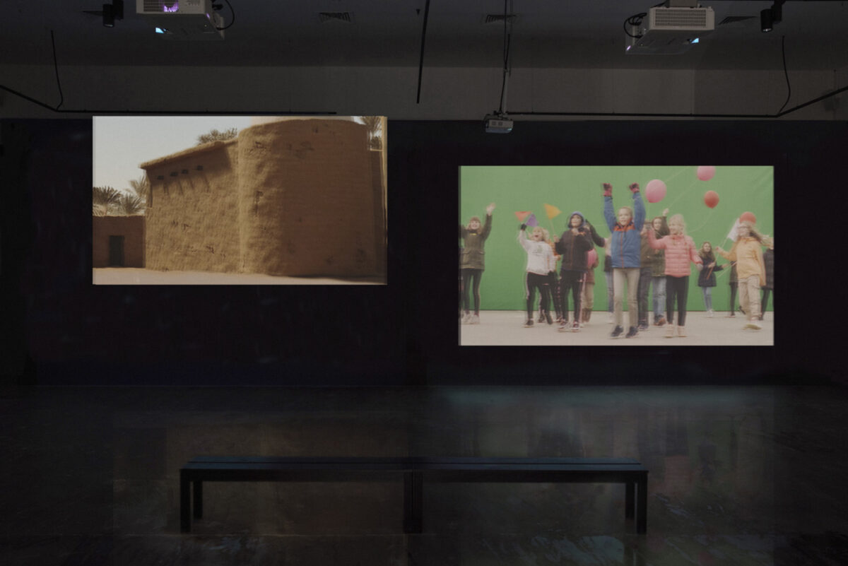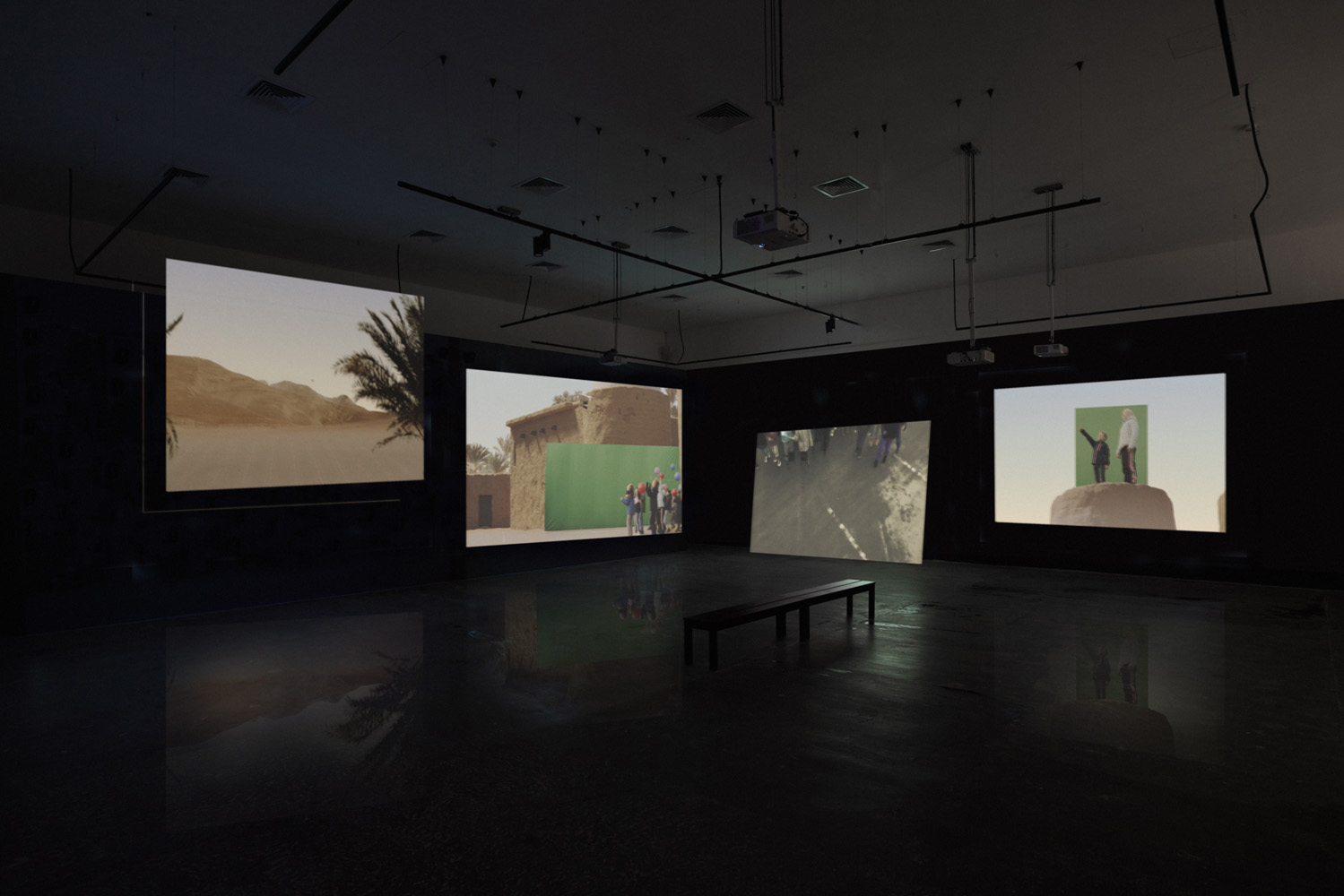 In its multi-channel installation, the video is physically edited across separate screens, each corresponding to specific camera angles and cuts drawn directly from Al-Akkad’s original film. The spatial arrangement of the channels follows the logic of the film’s editing, translating cinematic montage into a sculptural experience within the exhibition space.