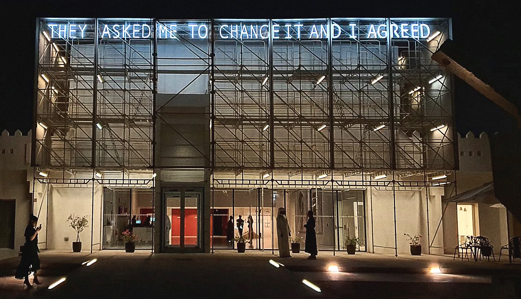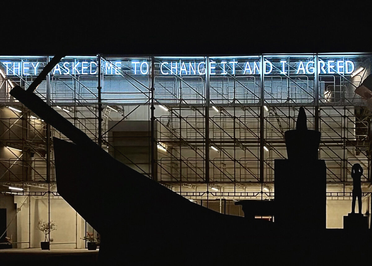 They Asked Me to Change It is a permanent neon installation on the façade of Mathaf: Arab Museum of Modern Art in Doha. The work displays the sentence “They Asked Me to Change It and I Agreed”, a quiet yet provocative gesture that reflects on the negotiations often hidden within institutional practice.