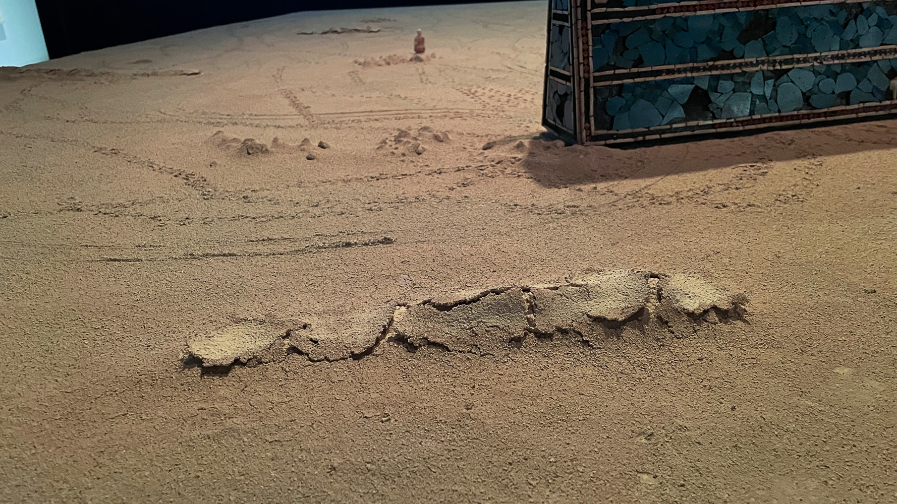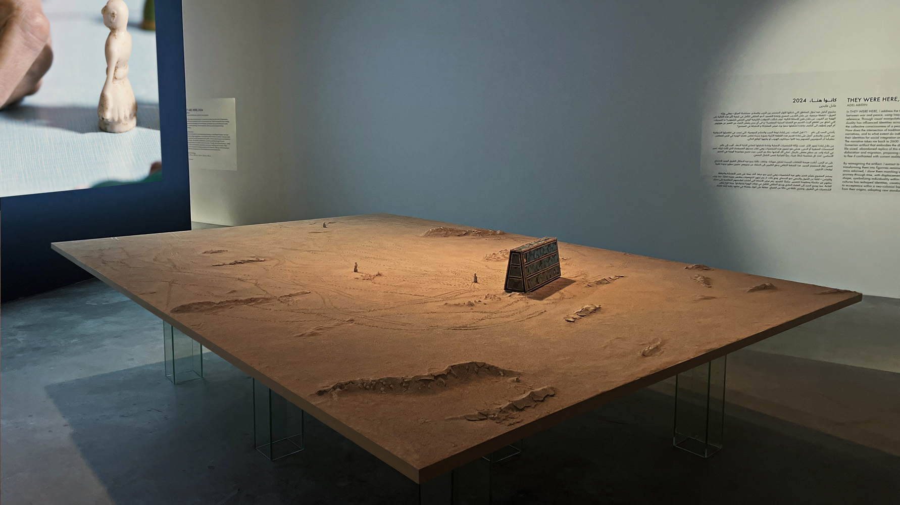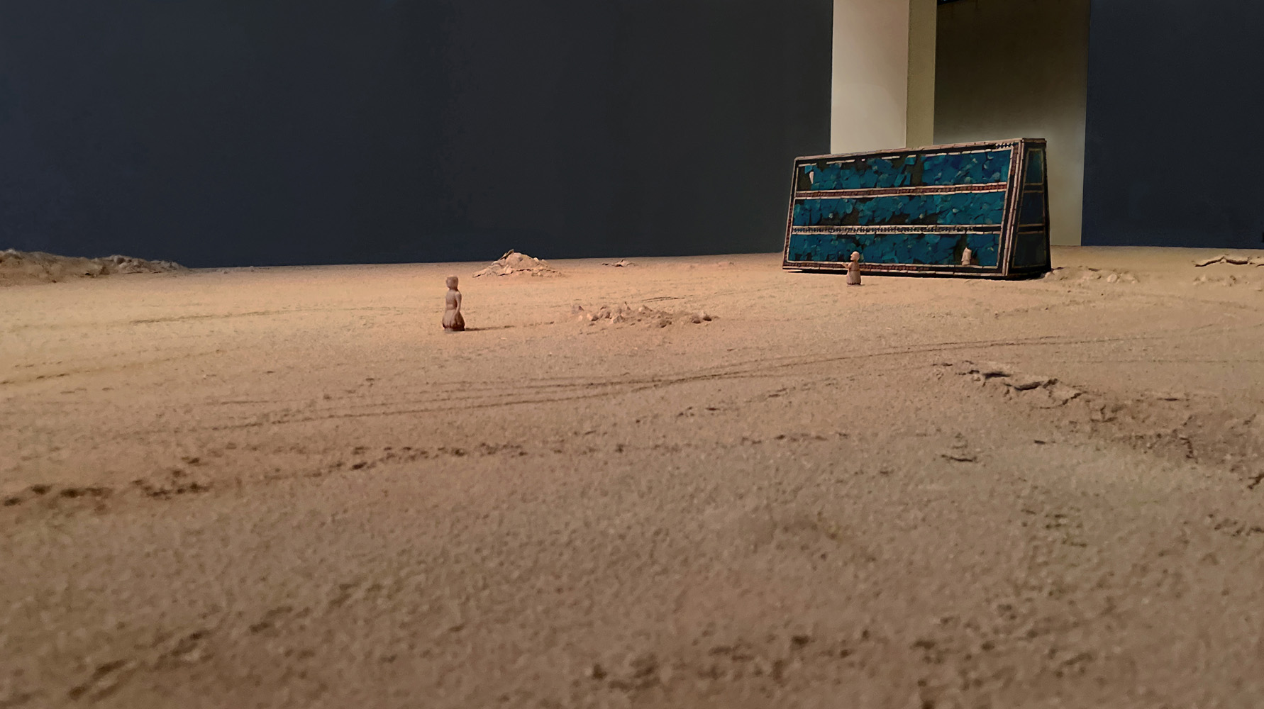 At the center of the installation stands Abandoned Relic: a one-to-one replica of the Standard of Ur, reimagined as a deserted object. Placed on a large table covered with clay and sand, it carries only the faint traces of figures that once moved across it. The table suggests the passage of time, while the emptied object proposes a hypothesis: that if the Sumerians were living today, they too would have chosen to abandon their civilization and flee.