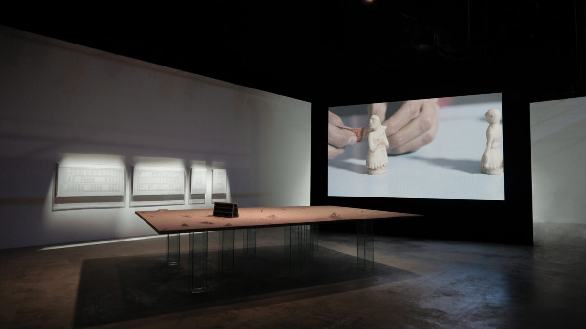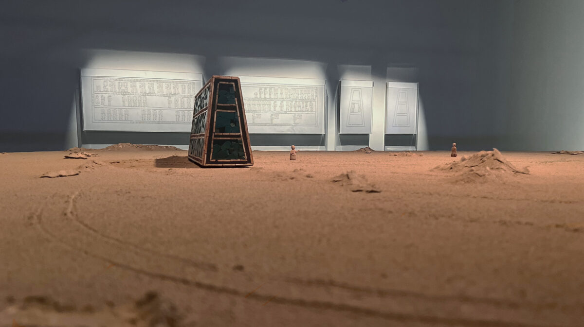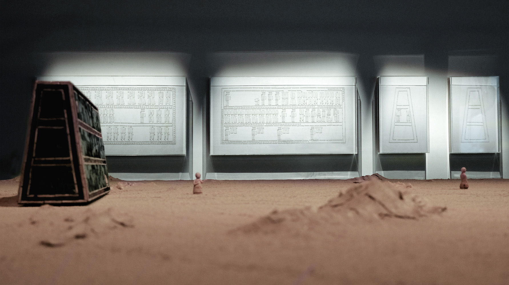 At the center of the installation stands Abandoned Relic: a one-to-one replica of the Standard of Ur, reimagined as a deserted object. Placed on a large table covered with clay and sand, it carries only the faint traces of figures that once moved across it. The table suggests the passage of time, while the emptied object proposes a hypothesis: that if the Sumerians were living today, they too would have chosen to abandon their civilization and flee.