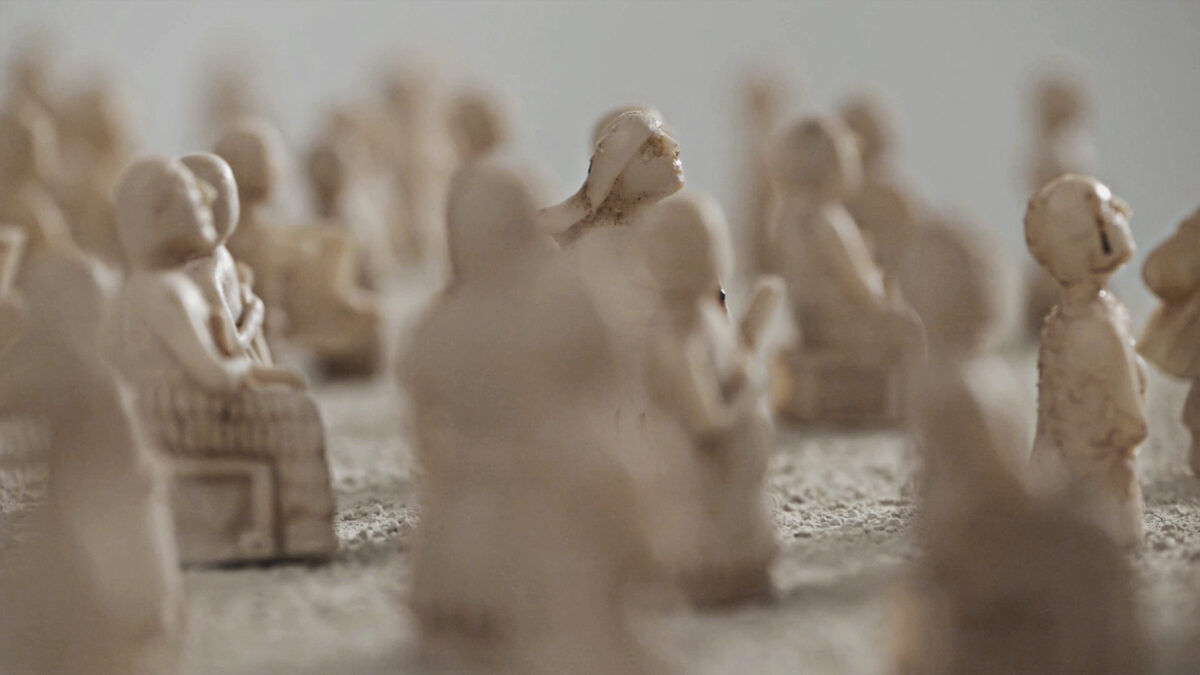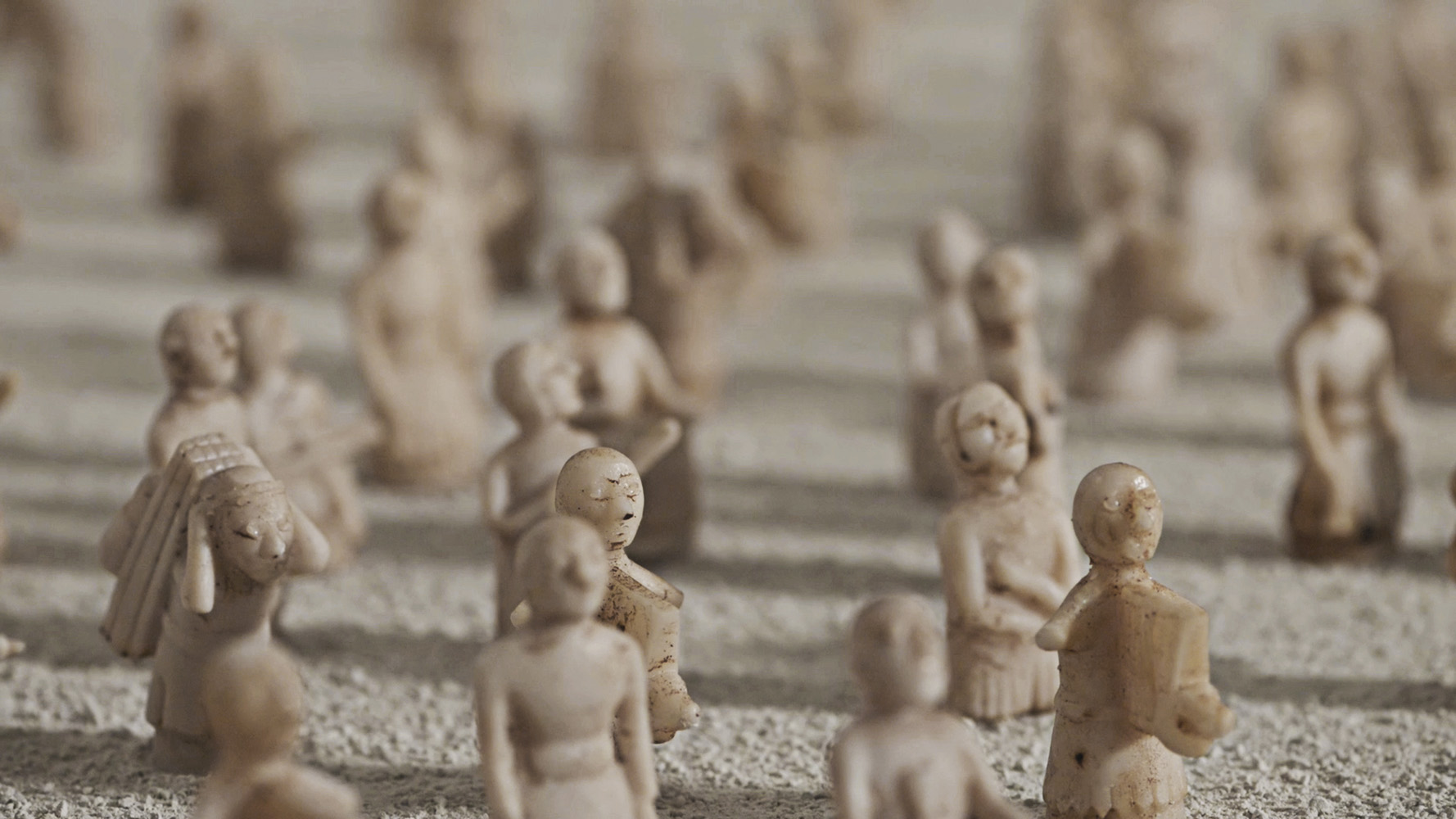 The missing figures reappear elsewhere in the installation, no longer part of a fixed narrative. Small sculpted bodies move away from the object and across a surface, leaving behind traces of their passage.