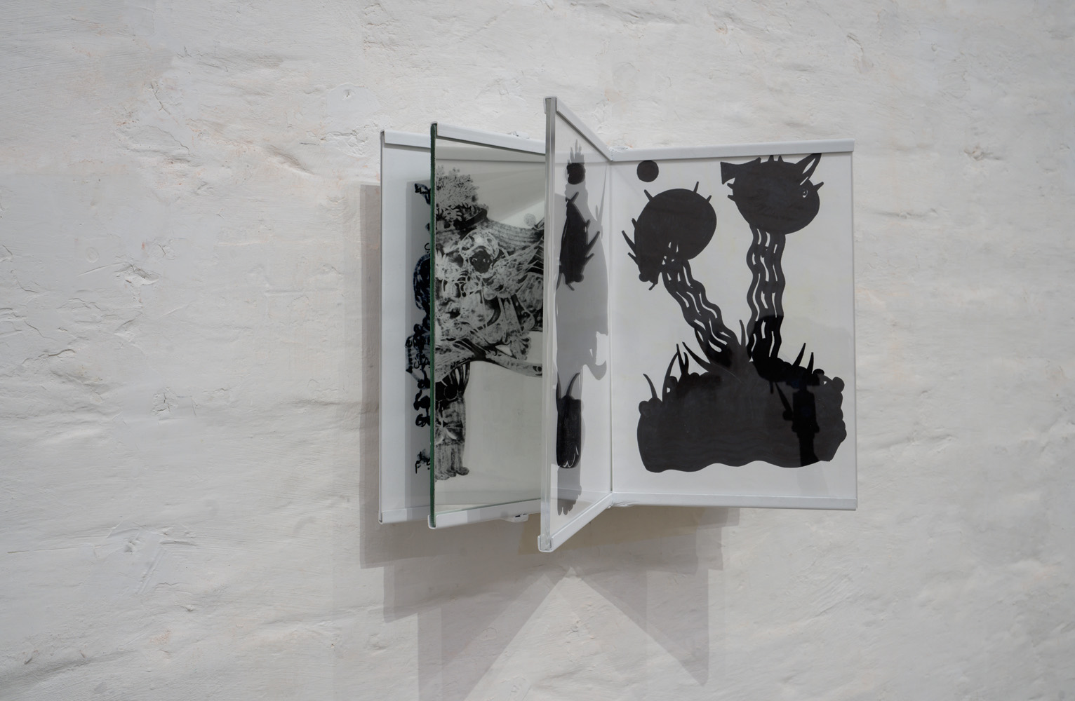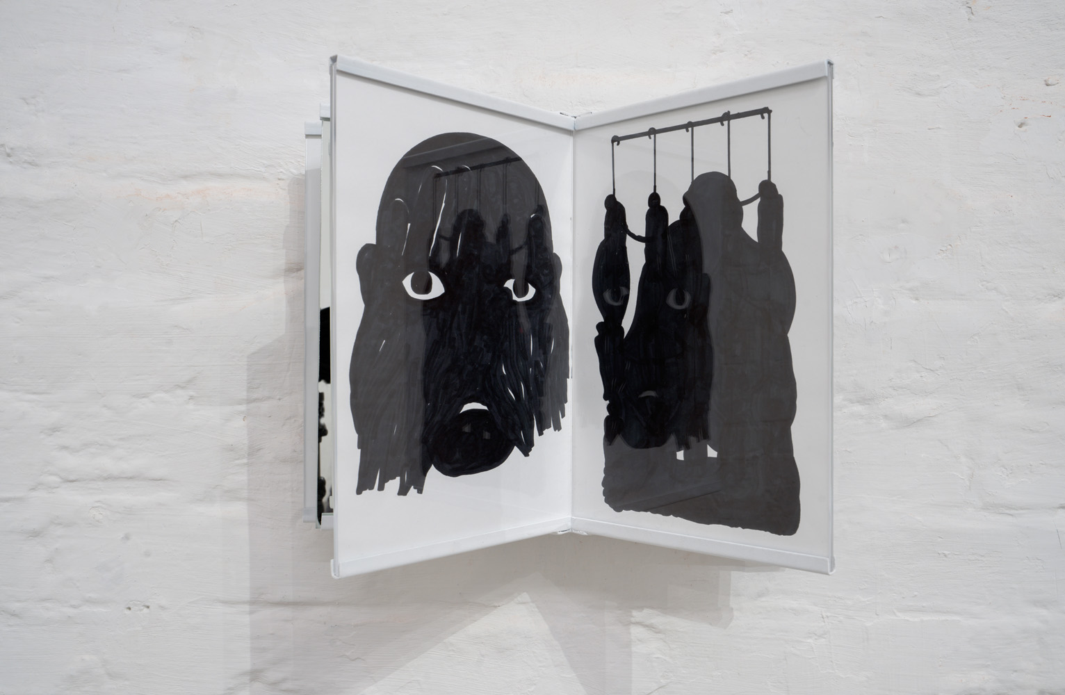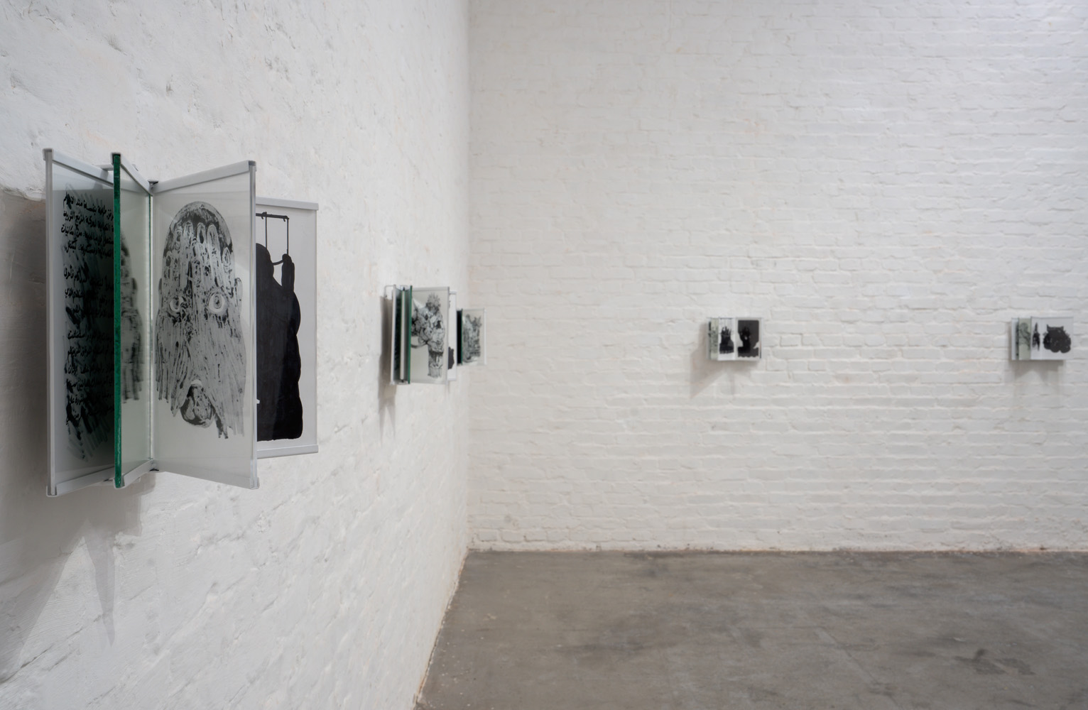 The drawings are displayed in custom acrylic frames incorporating mirrored surfaces, arranged to evoke the experience of browsing a book along the wall. Viewers move physically from one framed drawing to the next, engaging with the work as if navigating a fragmented historical record.