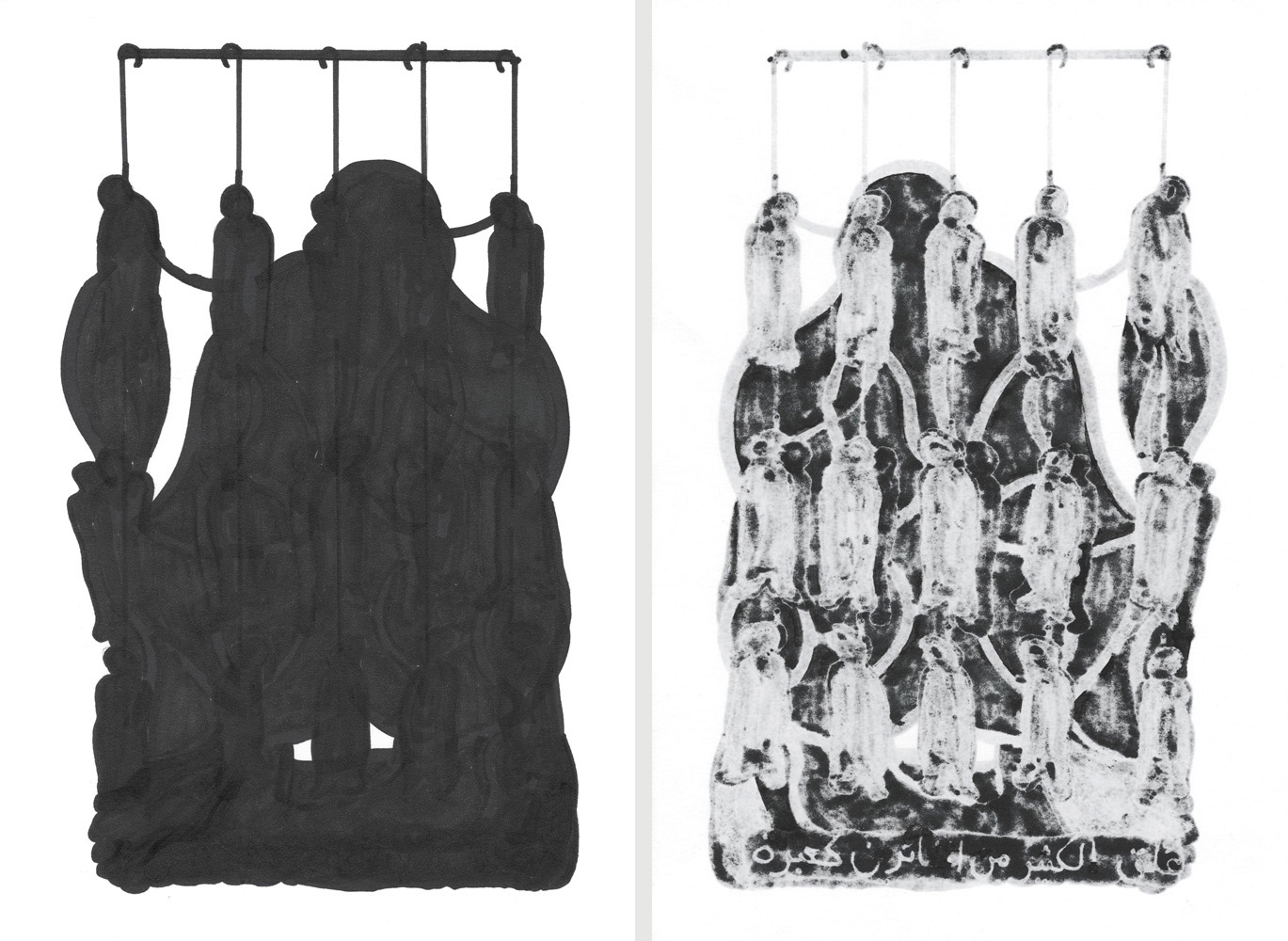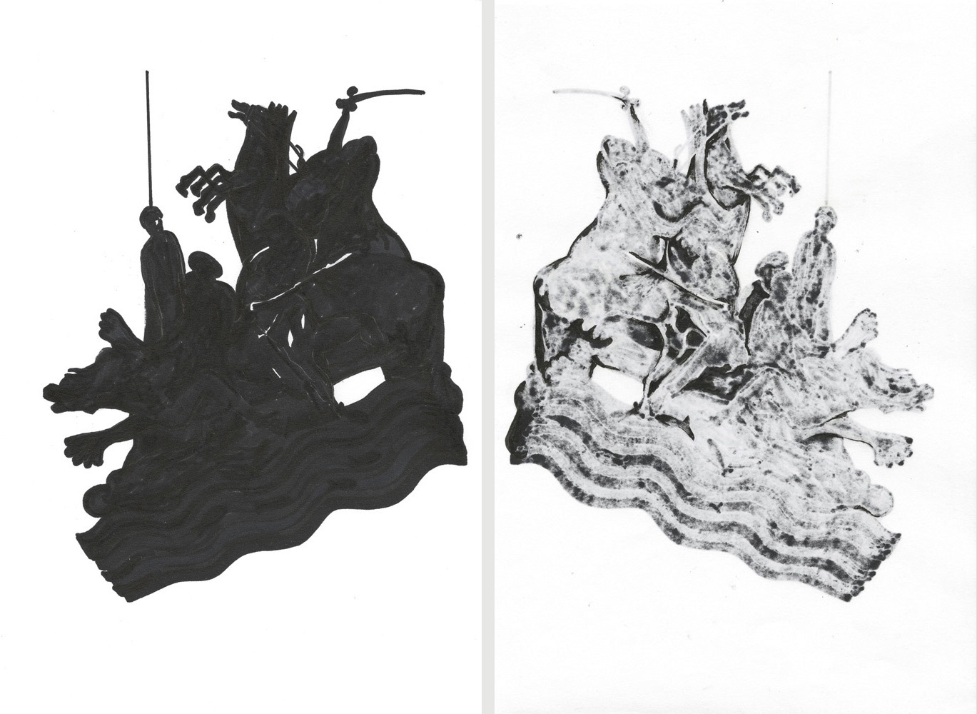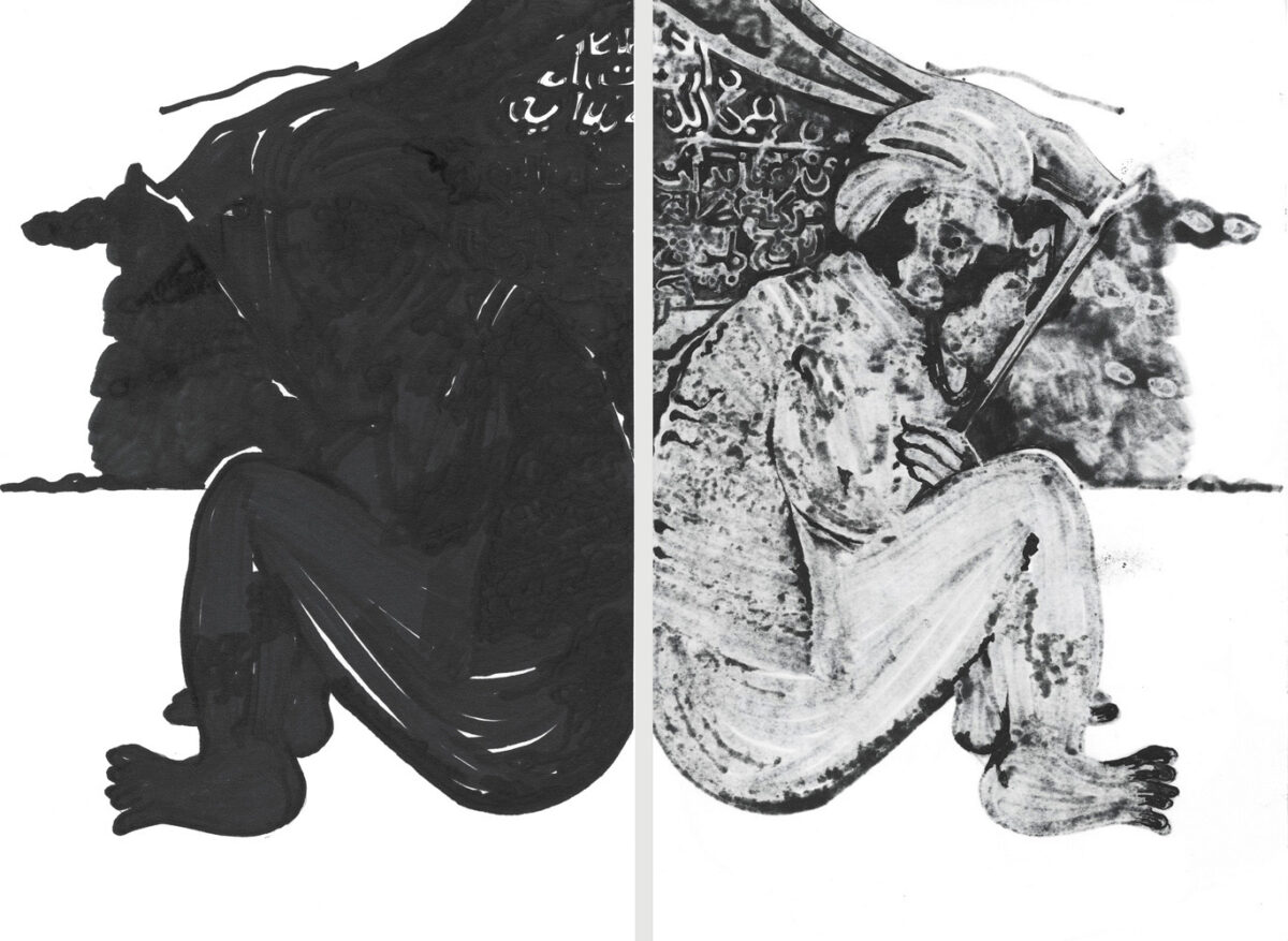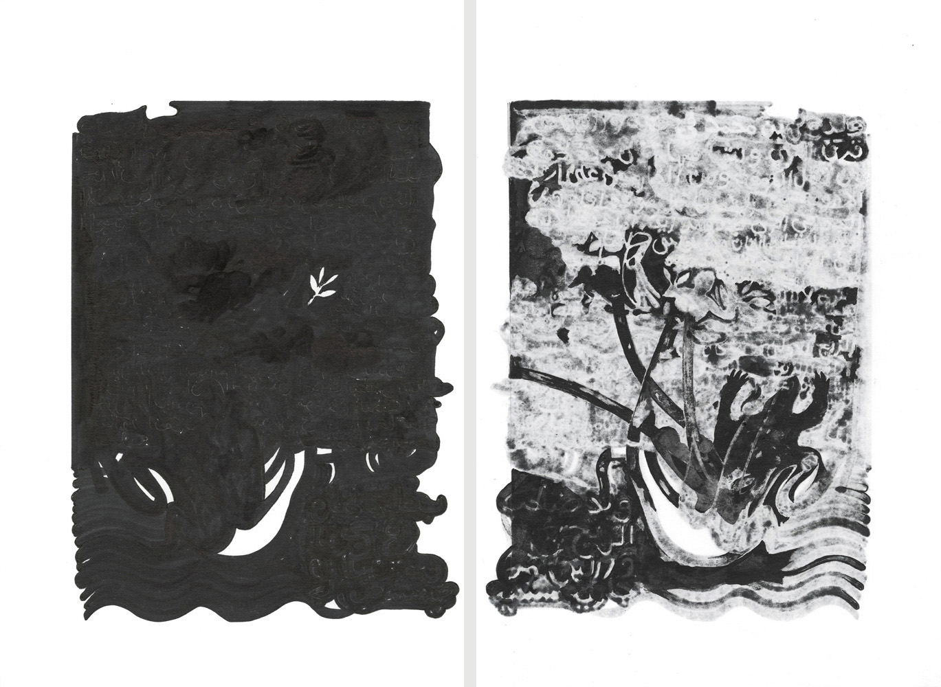 Unmatched Narratives presents the recorded history of the Zanj Rebellion (869–883 CE) as told by the victors. Using drawings formed through ink bleeding across paper, the work unfolds as a mixed-media wall installation stretching across the gallery like a black-and-white archive of historical episodes.