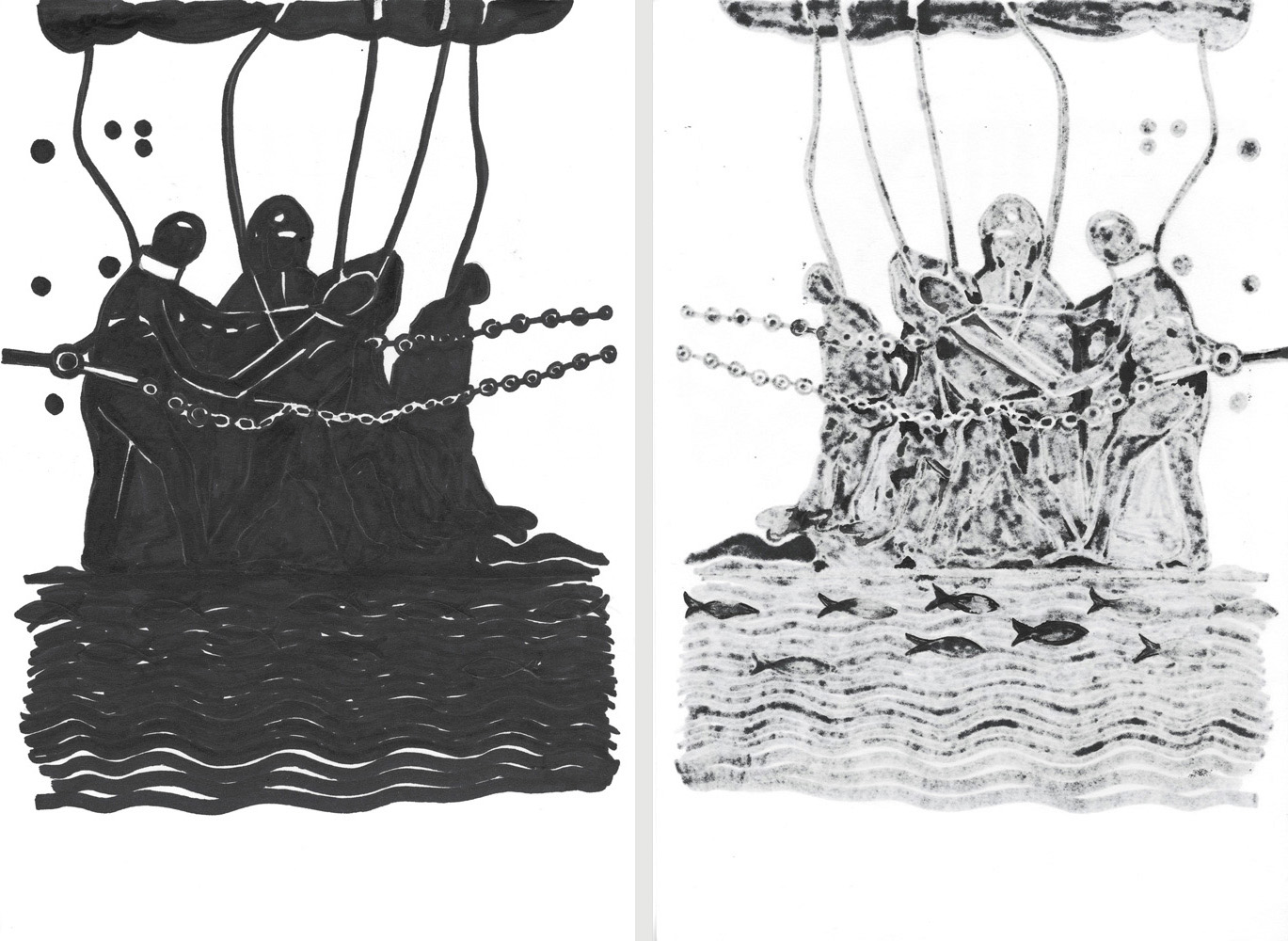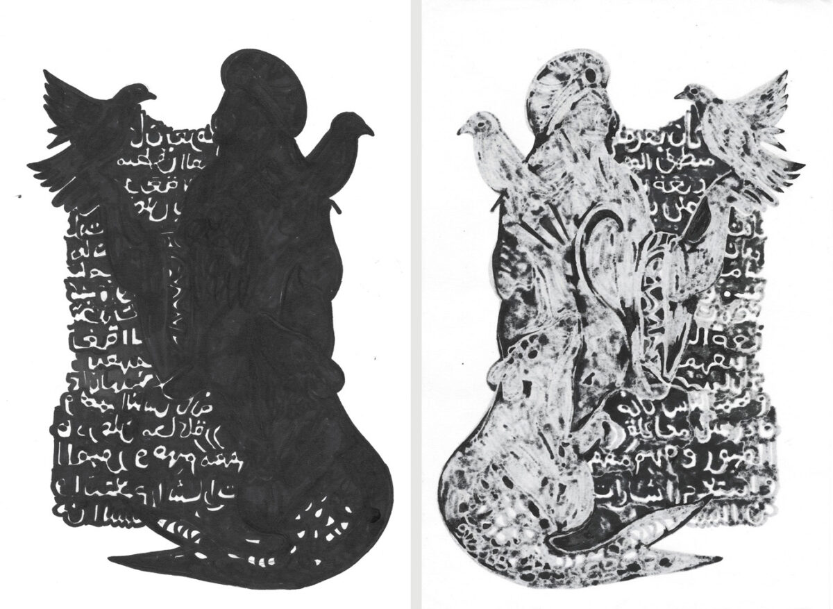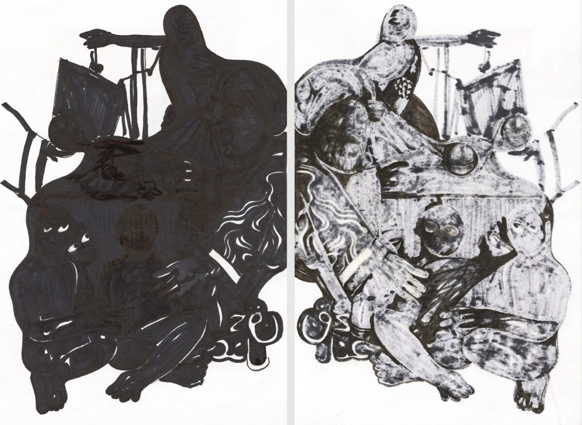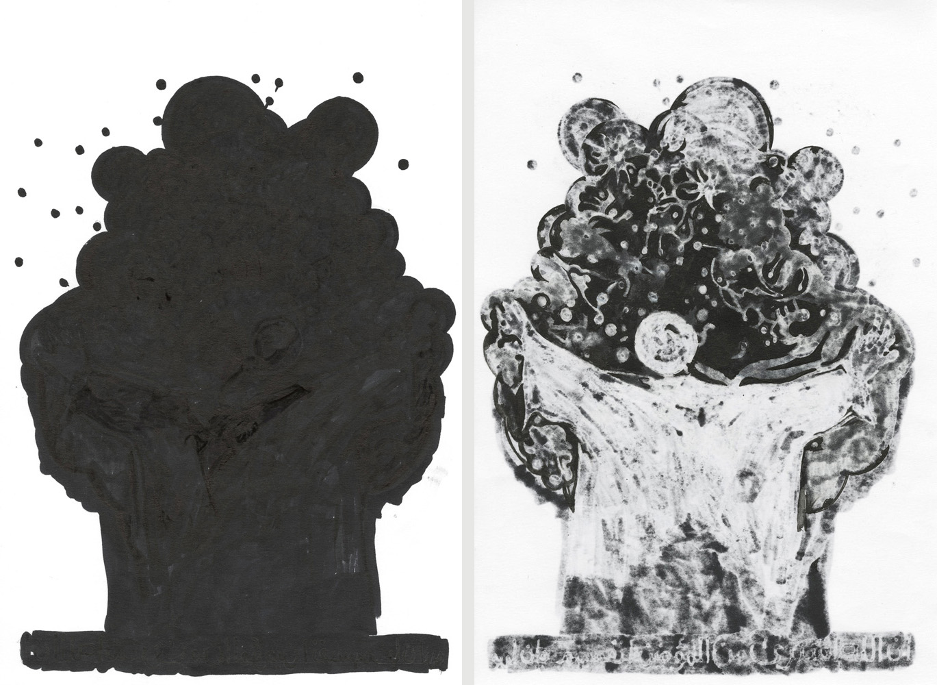 Unmatched Narratives presents the recorded history of the Zanj Rebellion (869–883 CE) as told by the victors. Using drawings formed through ink bleeding across paper, the work unfolds as a mixed-media wall installation stretching across the gallery like a black-and-white archive of historical episodes.